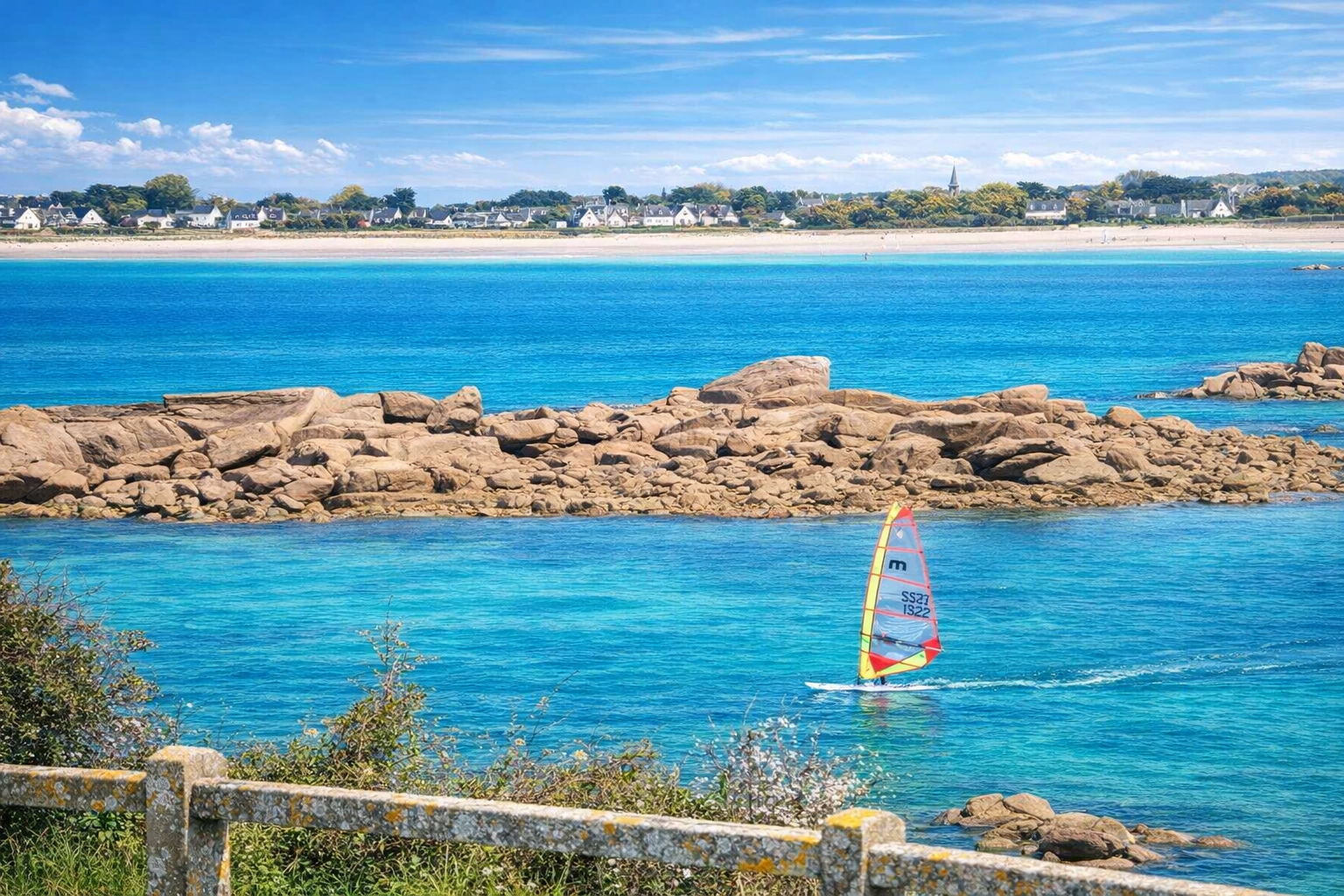 à l'entrée du port dans un environnement calme. La plage la plus proche est aux pieds de la propriété alors qu'à 200 mètres, celle de Pors Misclic est un site de surf réputé. Nous adorons nous y baigner dans les vagues ! La terrasse, orientée au sud, est ensoleillée et abritée des vents. La maison, confortable, peut accueillir jusqu'à 6 personnes . |